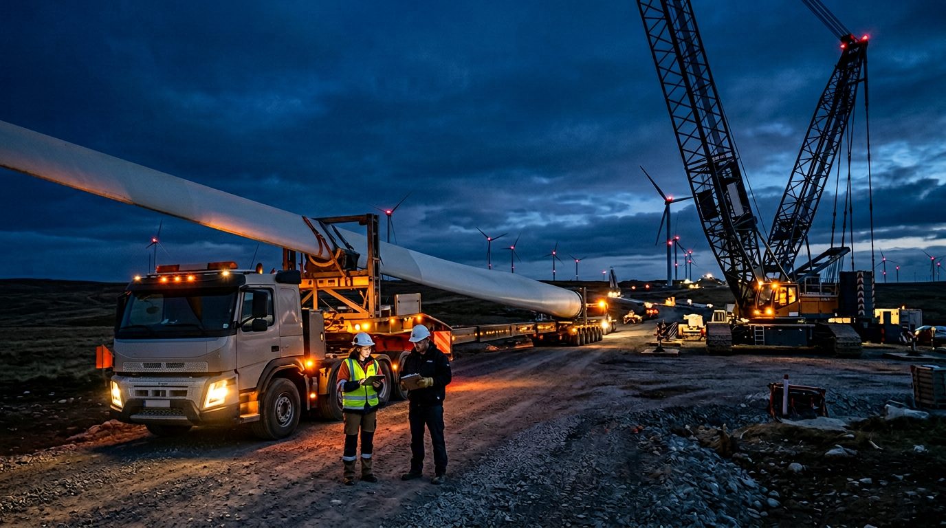 Komponenten-Übergabe am Windpark, Zustandserfassung Rotorblatt / Trafo, Windpark-Akte für Wiederholungstransporte.